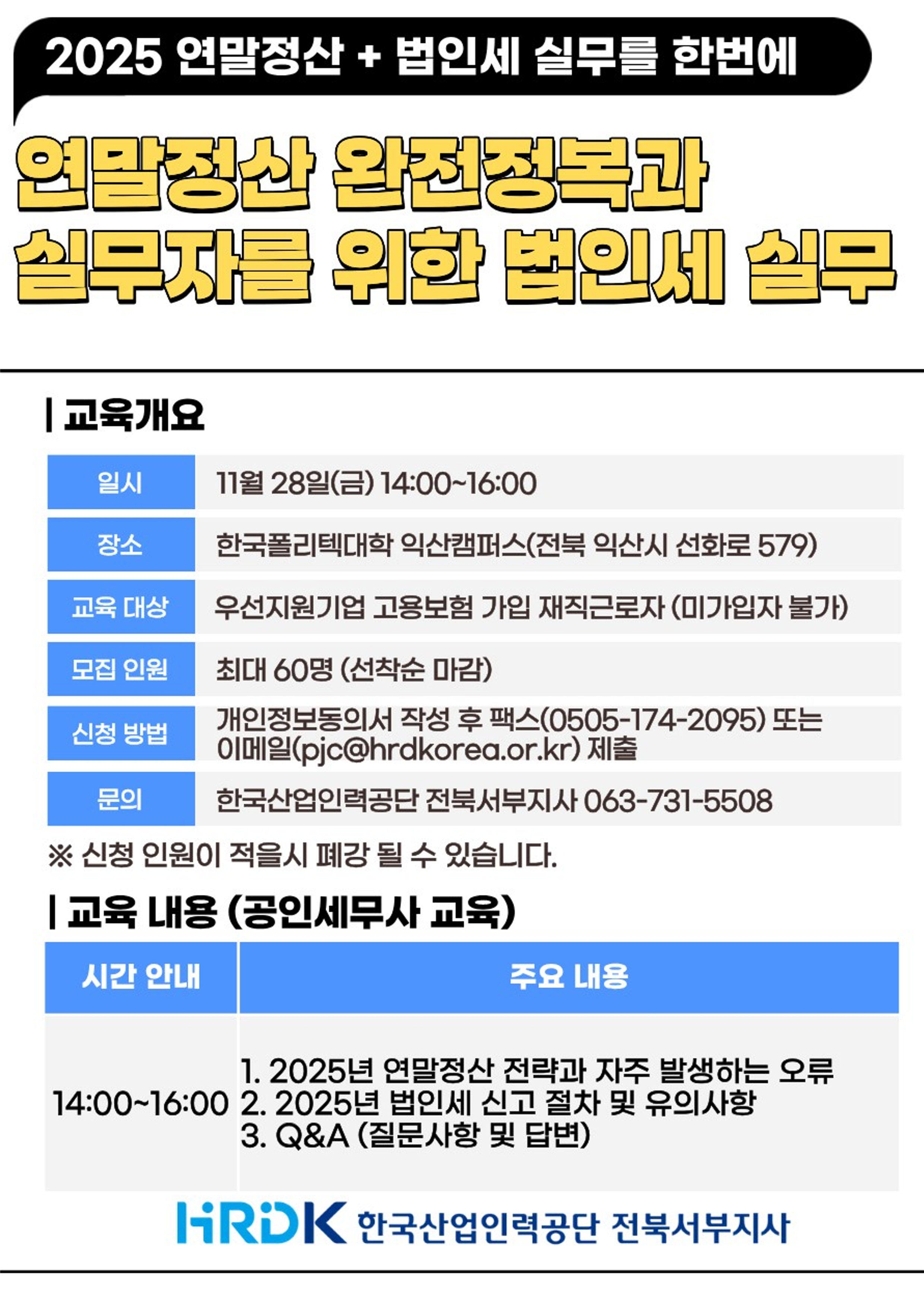 | 제목 | [외부공고] 2025 연말정산 완전정복과 법인세 실무 교육 안내 | ||