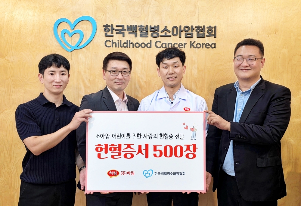 종합식품기업 ㈜하림이 소아암 어린이 치료를 위해 임직원들이 모은 사랑의 헌혈증서 500장을 한국백혈병소아암협회에 전달했다.