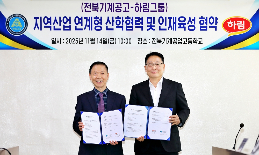 하림, 전북기계공고와 ‘맞춤형 인재’ 육성 11월 14일 MOU 체결… ‘하림반’ 신설, 단순 채용 넘어 ‘교육 공동체’로 ![]() 하림은 11월 14일 국립 전북기계공업고등학교(교장 임인현)와 ‘채용연계형 적성중심 인재육성’ 협약(MOU)을 체결하고, 학생 선발부터 교육, 현장실습, 채용까지 전 과정을 공동으로 진행하는 ‘산학일체형’ 모델을 가동한다고 밝혔다.