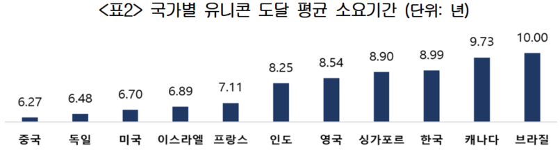 유니콘 기업으로의 성장속도도 우리나라가 더딘 것으로 나타났다. 기업 설립부터 유니콘으로 성장하기까지 걸린 기간을 전수조사를 통해 분석한 결과, 우리나라 유니콘 기업들은 평균 8.99년이 소요됐다. 중국이 6.27년으로 가장 빨랐고, 독일(6.48년), 미국(6.70년), 이스라엘(6.89년)의 유니콘 기업들은 평균 6년대의 시간이 걸렸다. 유니콘 보유 상위 10개국 전체의 평균 소요기간은 6.97년이었다.